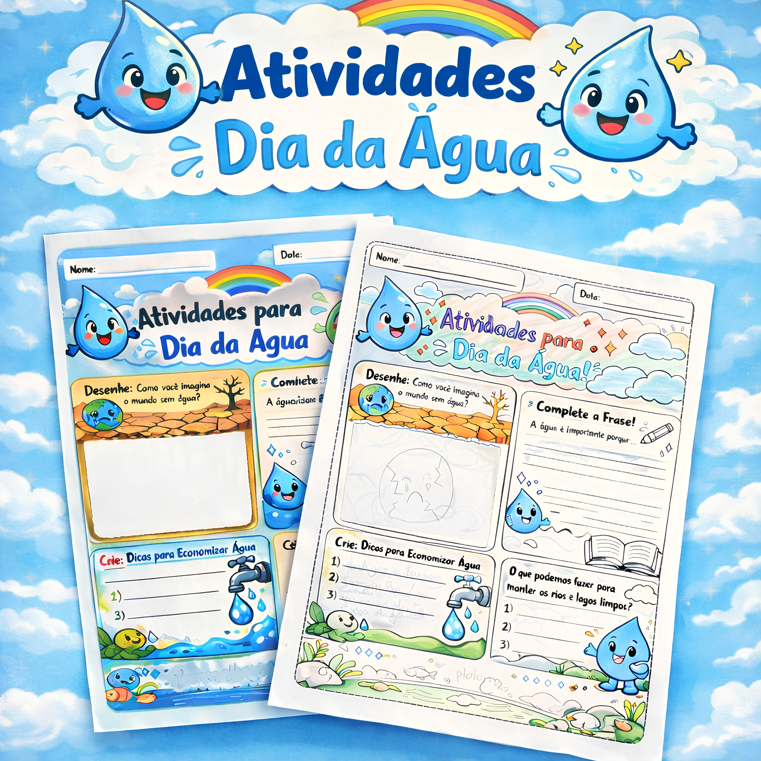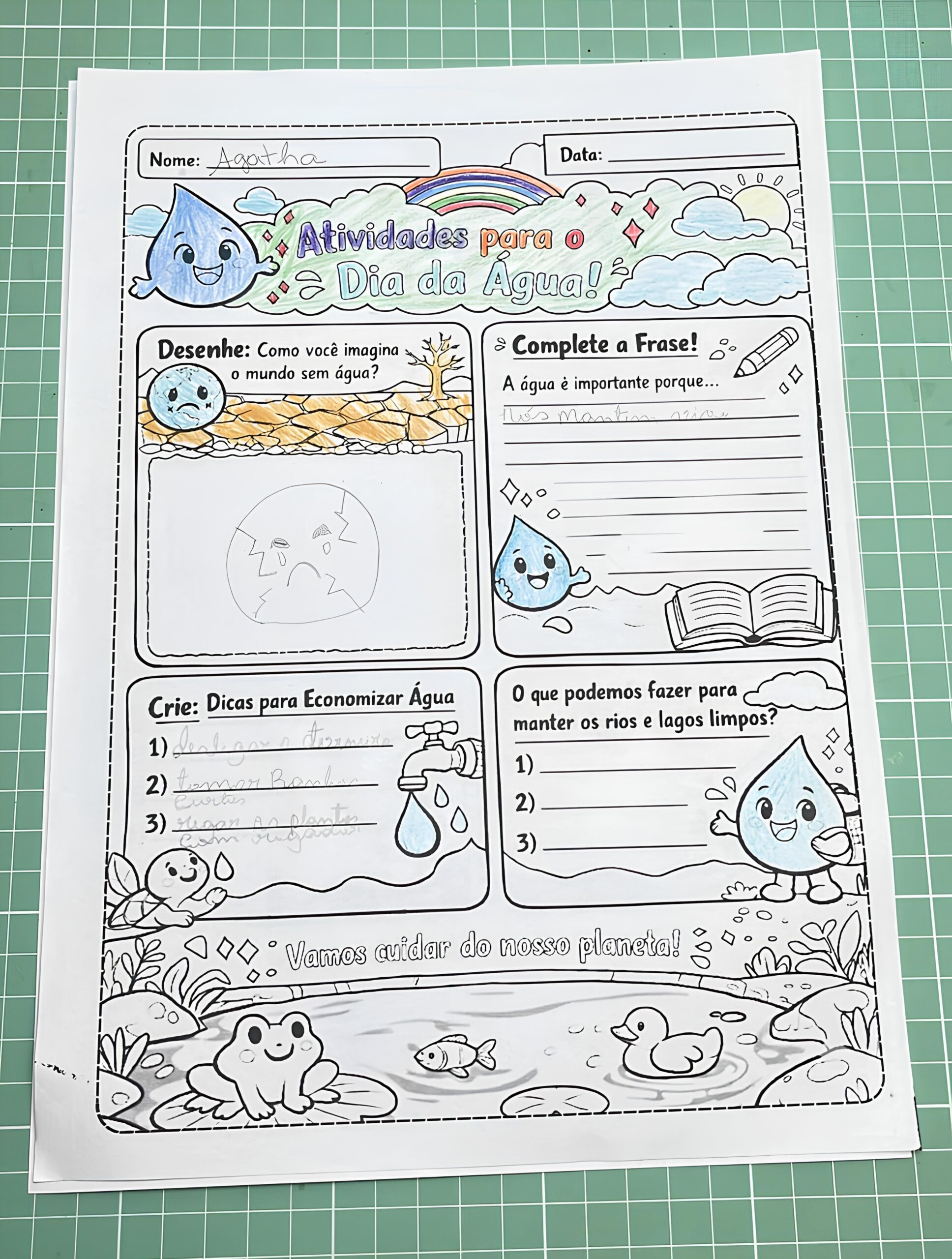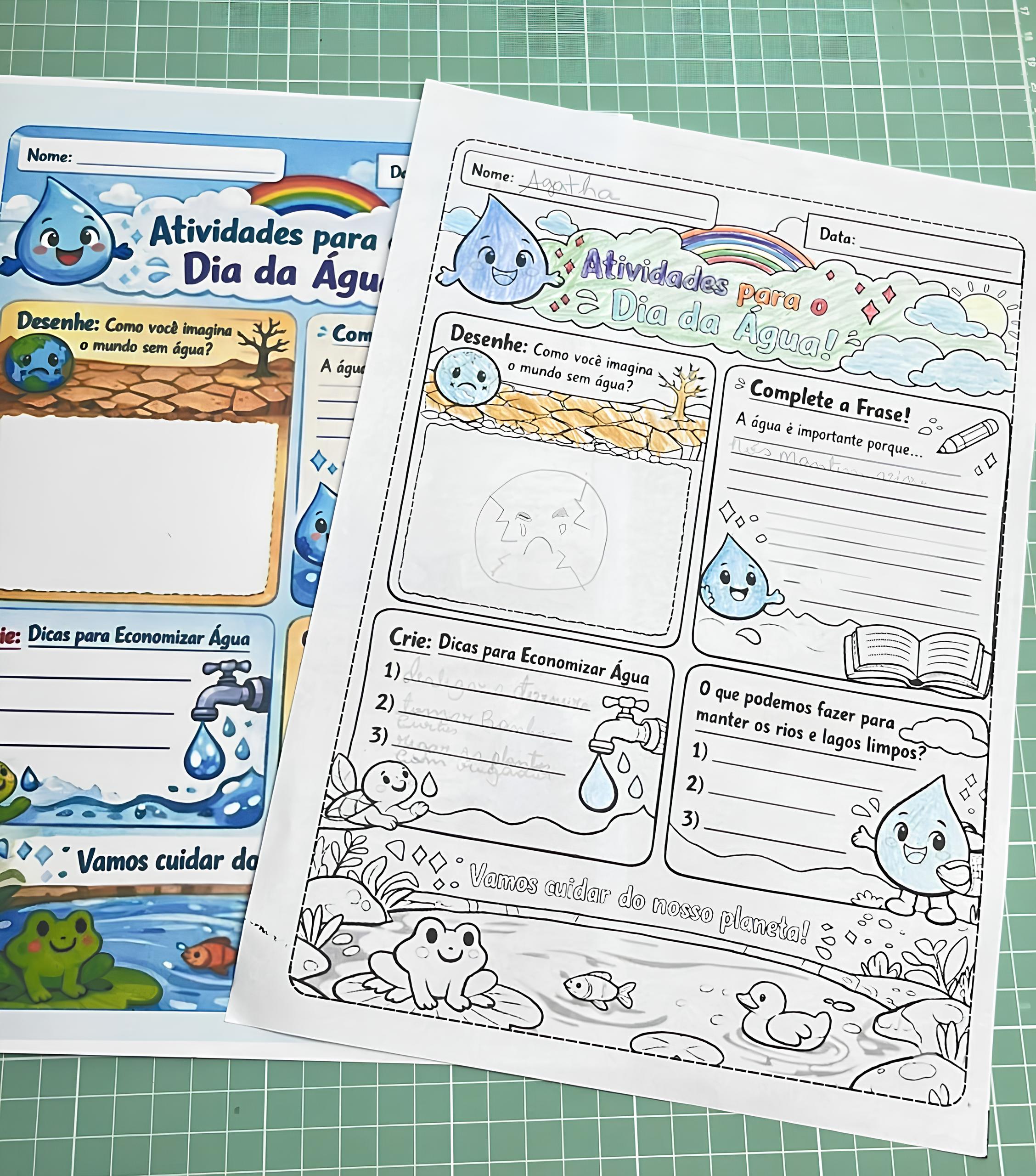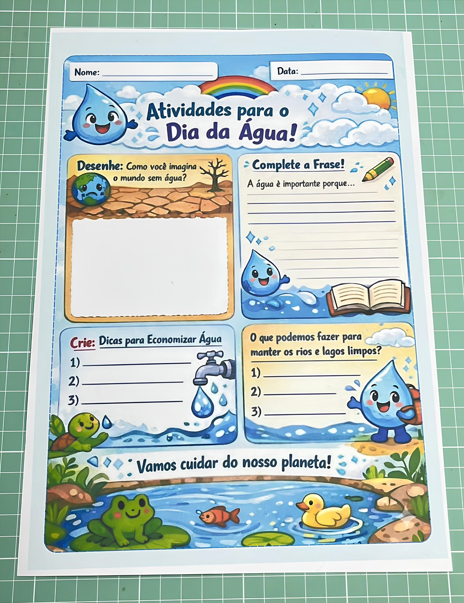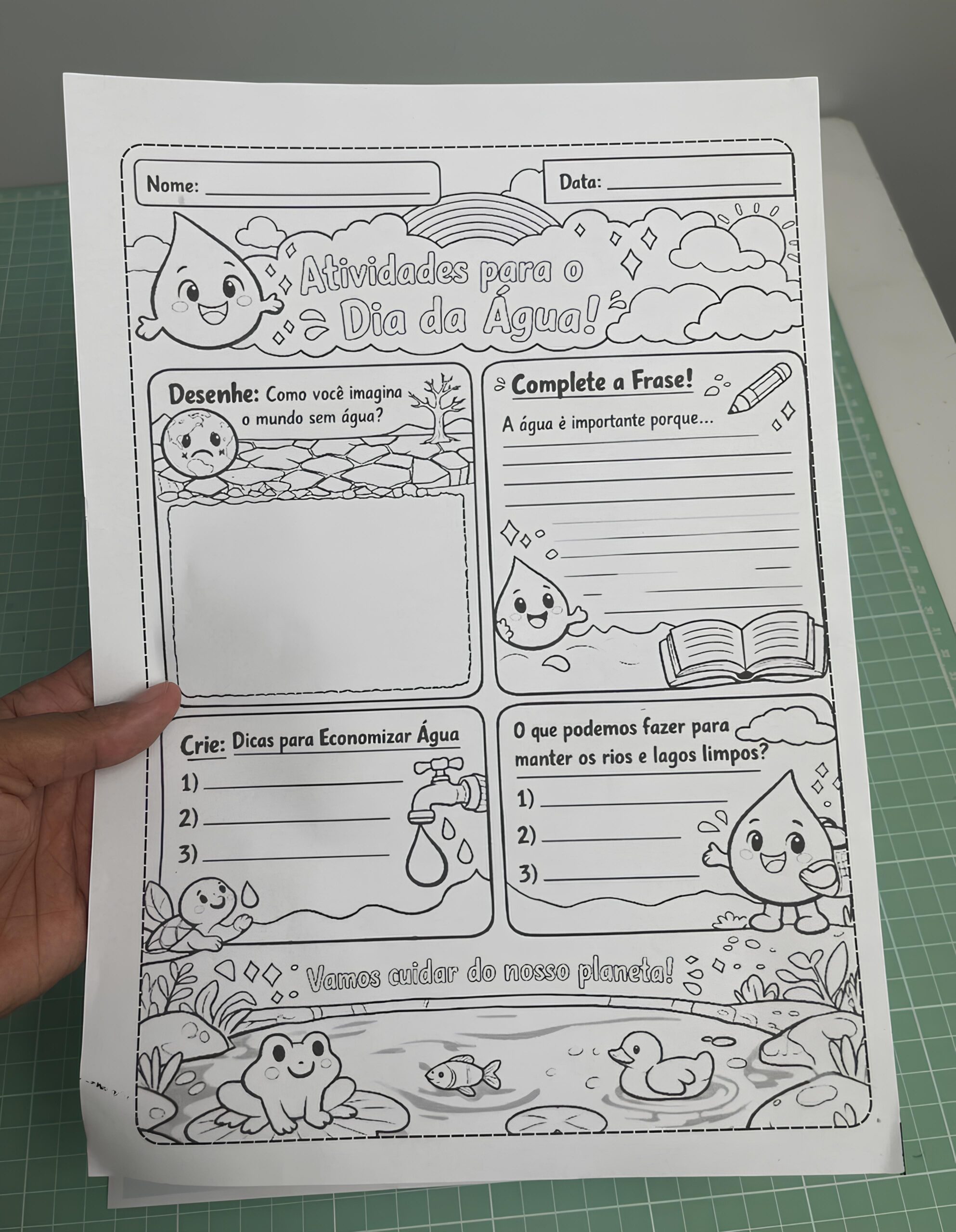 Atividade educativa em comemoração ao Dia da Água, que estimula os alunos a refletirem sobre a importância da água para a vida. Por meio de desenho, escrita e criação de dicas, as crianças desenvolvem a consciência sobre o uso responsável da água e a preservação dos rios e lagos. 💧🌍
